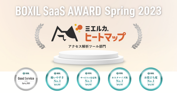 今回の「BOXIL SaaS AWARD Spring 2023」は、2022年1月1日から2022年12月31日までの1年間で新たに投稿された口コミ約14,000件を審査対象としており、「ミエルカヒートマップ」は「アクセス解析ツール部門」で「Good Service」、「使いやすさNo.1」、「サービスの安定性No.1」、「カスタマイズ性No.1」、「お役立ち度No.1」に選ばれました。