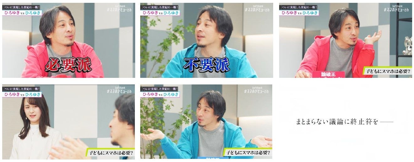 ソフトバンク株式会社は、歯に衣着せぬ物言いで“論破王”と称されるひろゆきさんを起用したWEBコンテンツ、『【世紀の一戦】ひろゆきvsひろゆき 「子どもにスマホは必要?」篇』を3月7日(火)から公開します。「子どもにスマホは必要?」というテーマに対し、“「必要」派のひろゆき”さんと“「不要」派のひろゆき”さんが徹底討論。論破王「ひろゆき VS ひろゆき」という世紀の一戦がついに実現しました。