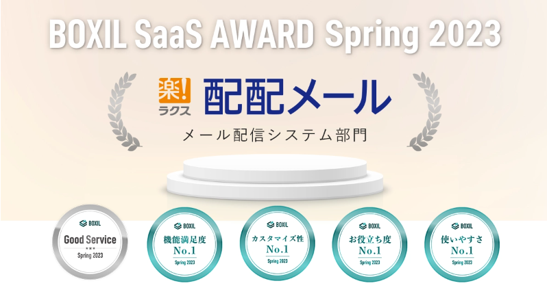 「BOXIL SaaS AWARD(ボクシル サース アワード)」は、SaaS比較サイト「BOXIL SaaS(ボクシル サース)」を運営するスマートキャンプが、優れたSaaSを審査、選考、表彰するイベントです。今回の「BOXIL SaaS AWARD Spring 2023」は、2022年1月1日から2022年12月31日までの1年間で新たに投稿された口コミ約14,000件を審査対象としており、「配配メール」はメール配信システム部門で「Good Service」「機能満足度No.1」「カスタマイズ性No.1」「お役立ち度No.1」「使いやすさNo.1」に選ばれました。