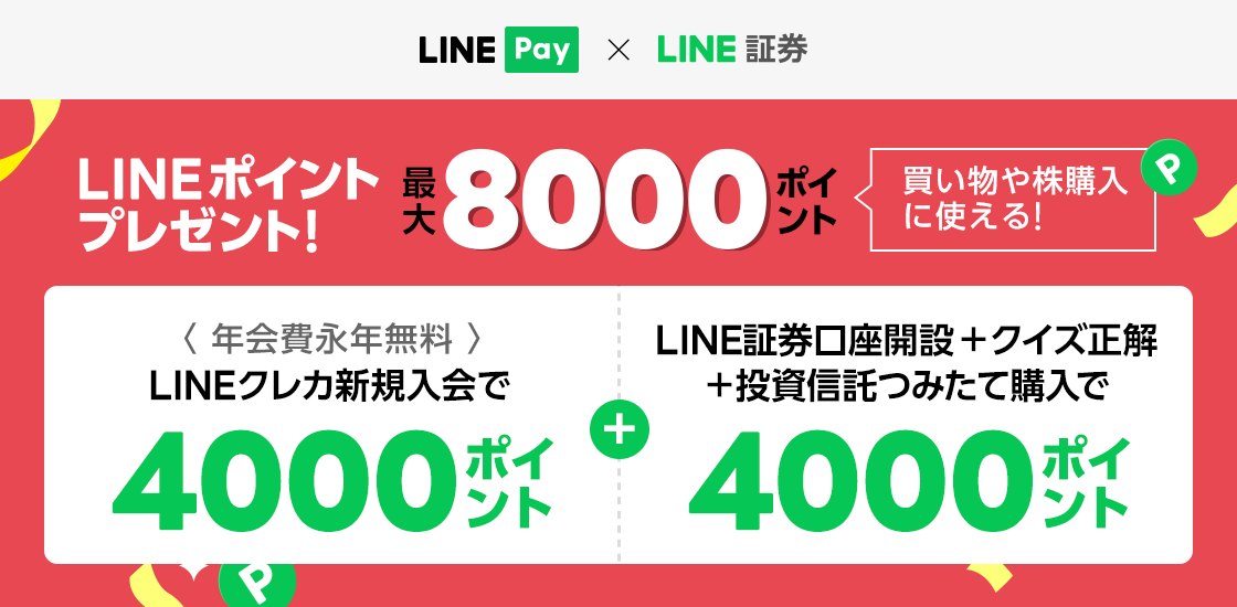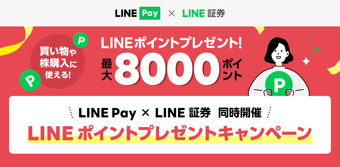 このたび、「LINE Pay」でのお買い物や、LINE証券での株購入など、両サービスでより便利でお得にLINEポイントをご活用いただけるよう「LINE Pay × LINE証券 同時開催 LINEポイントプレゼントキャンペーン」を開催いたします。本キャンペーンでは、期間中、参加条件を達成された方に、最大LINEポイント最大8000ポイントをプレゼントいたします。