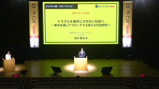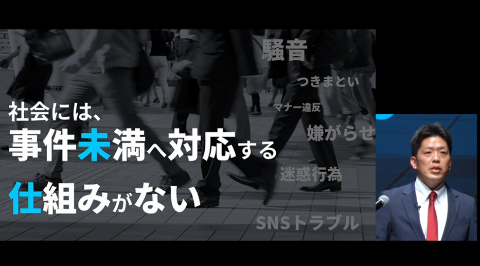 当社代表の田中はピッチの冒頭で、昨年の30万件にも迫る全国の警察に寄せられた近隣トラブルの件数と、近隣トラブルに起因する多くの事件の報道を引き合いに出し、「防げるはずの事件を防ぐ、新しい社会インフラを創る」というテーマでのピッチを行いました。