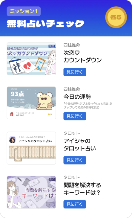 下記4つの無料運勢をチェックすると、各5ボーナスコイン(最大20ボーナスコイン)を獲得できます。