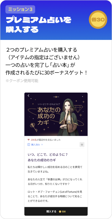 現在開催中のミッション・スタンプラリーにおいて「ミッション3:プレミアム占いを購入」でもお使いいただけるクーポンです!