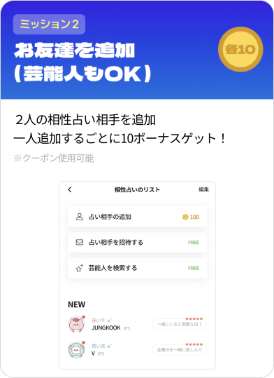 フォーステラー占いで大人気の「相性占い」の相手に、2人のお友達を追加すると、各10ボーナスコイン(最大20ボーナスコイン)を獲得できます。