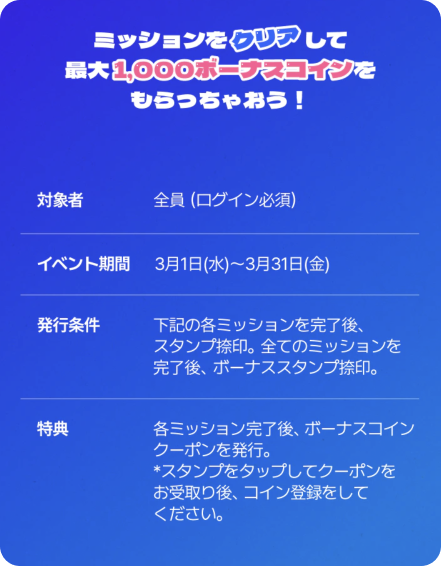 各ミッションをクリアしスタンプを集めることで、ボーナスコインをGETすることができます!