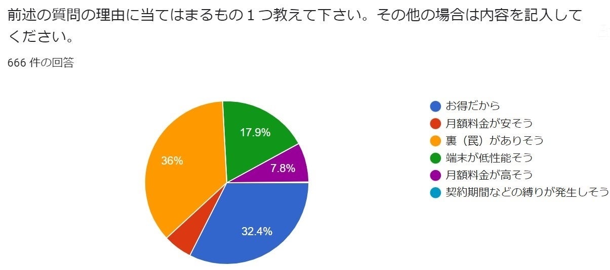 1円スマホに対してネガティブイメージを抱いている1位の理由は「裏(罠)がありそう(36%)」でした。2番目に多い理由が「端末が低性能そうだから(17.9%)」でした。