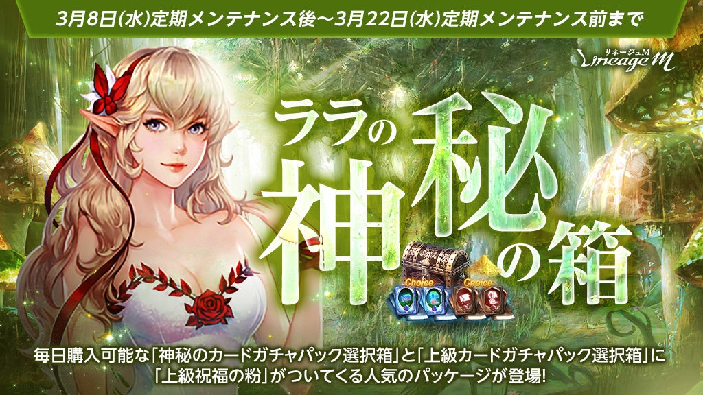 「神秘のカードガチャパック選択箱」1個と、「上級カードガチャパック選択箱」1個と一緒に「上級祝福の粉」2,000個がセットになった「ララの神秘の箱」が登場しました。