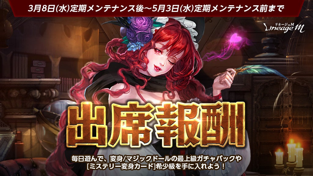 さらに連続出席報酬では、複数の「ドラゴンの聖水(イベント)」や武器や防具に祝福効果を付与できる「祝福付与の巻物(刻印)」、希少級の変身カードの合成に挑戦できる「[[ミステリー変身カード]希少級」等が獲得できます。