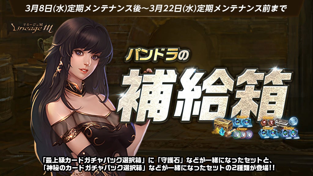 「最上級カードガチャパック選択箱」1個と一緒に「守護石」1個、「コイン選択箱」3個、「上級祝福の粉箱」2個、「パンドラの製作証書」1個がセットになった「パンドラの補給箱(守護石)」と、「最上級カードガチャパック選択箱」1個と一緒に「神秘のカードガチャパック選択箱」1個、「上級カードガチャパック選択箱」3個、「パンドラの製作の証」1個がセットになった「パンドラの補給箱(ガチャパック)」の2種類が登場しました。