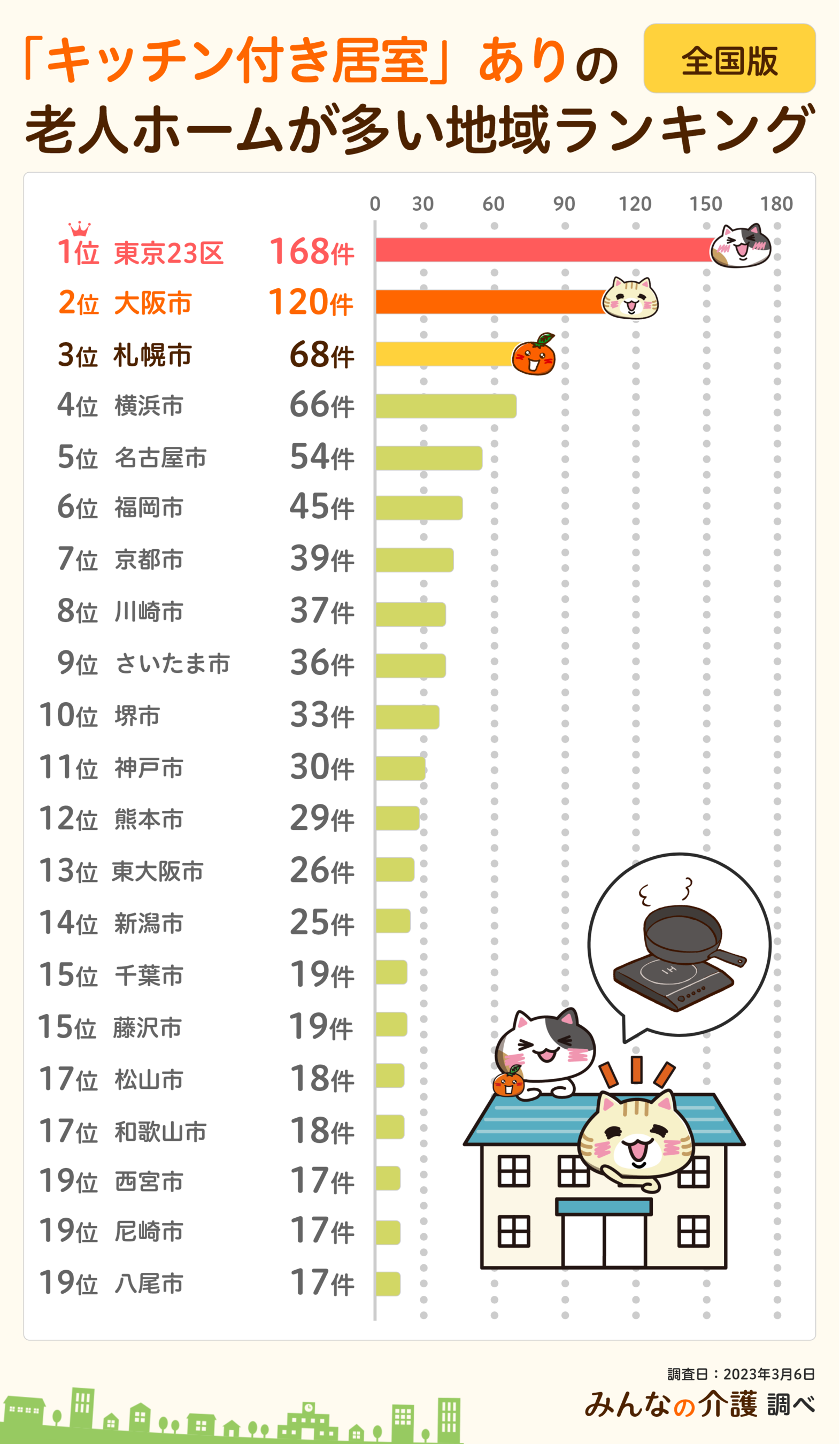 そこで今回は、「みんなの介護」掲載施設のうち「キッチン付き居室」がある老人ホームについて全国を調査。多い地域順に、ランキング形式にまとめました。