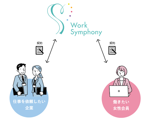 「ワーク・シンフォニー」では、仕事を依頼したい企業と働きたい女性会員との業務委託契約の窓口は、運営会社であるワーク・シンフォニー株式会社様が行います。