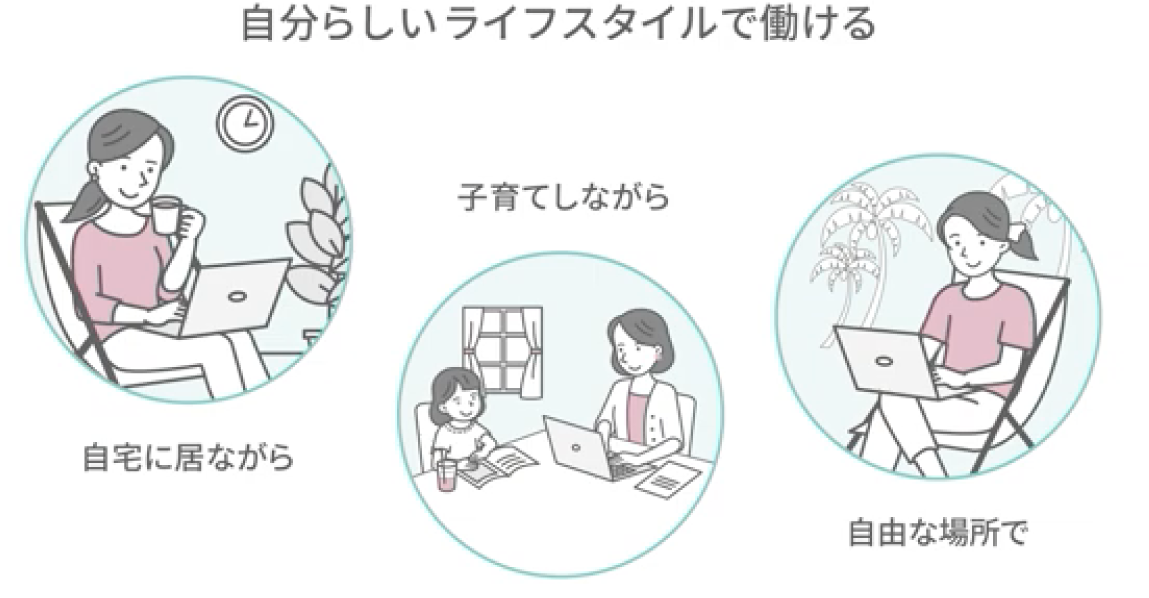 ライフスタイルに合わせての勤務が可能かつ、チームでの進捗と状況確認もできるので育児中の合間に働きたい人や副業として働きたい人など、働く場所や時間を気にせず、自分のスキルを活かした新しい働き方が可能です。