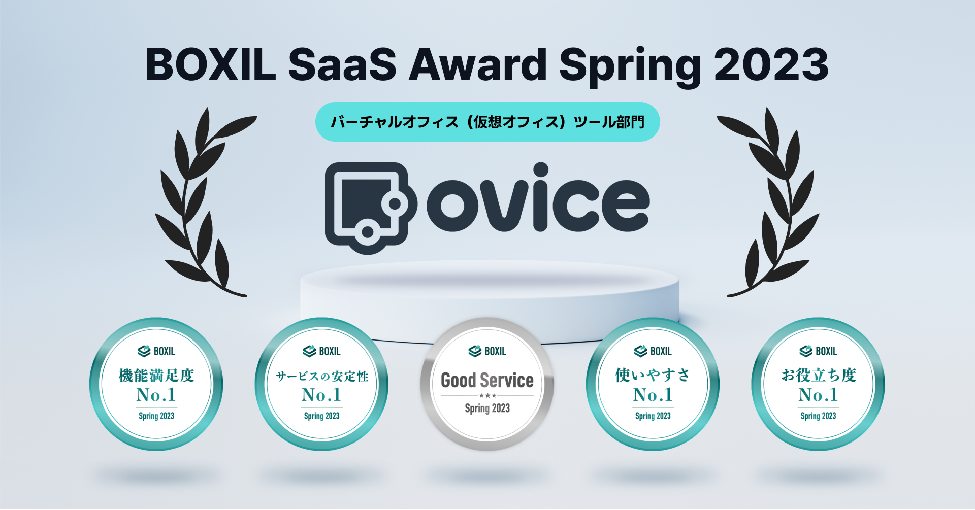 「BOXIL SaaS AWARD(ボクシル サース アワード)」は、SaaS比較サイト「BOXIL SaaS(ボクシル サース)」を運営するスマートキャンプが、優れたSaaSを審査、選考、表彰するイベントです。年1回、スマートキャンプが独自に定めた記念日である毎年3月4日の「SaaS」の日を記念して発表される本イベントのほか、Spring、Summer、Autumn、Winterの四半期ごとにも、優れたSaaSが表彰されます。今回「ovice」は、この「BOXIL SaaS AWARD 2023」と「BOXIL SaaS AWARD Spring 2023」の同時受賞となりました。今回の「BOXIL SaaS AWARD Spring 2023」では、2022年1月1日から2022年12月31日までの1年間で新たに投稿された口コミ約14,000件が審査対象なり、「ovice」は「バーチャルオフィス(仮想オフィス)ツール部門」で「Good Service」、「サービスの安定性No.1」、「機能満足度No.1」、「お役立ち度No.1」、「使いやすさNo.1」に選ばれました。