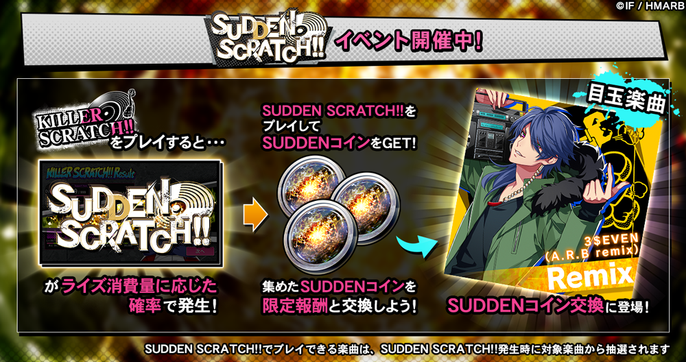 イベント期間中、KILLER SCRATCH!!をプレイするとライズ消費量に応じた確率でSUDDEN SCRATCH!!が発生します。SUDDEN SCRATCH!!をプレイすると、通常の報酬アイテムの他、限定アイテム「SUDDENコイン」を獲得することができます。「SUDDENコイン」を集めることで、新楽曲「3$EVEN(A.R.B remix)」と交換することが可能です。詳細はアプリ内お知らせをご確認ください。
