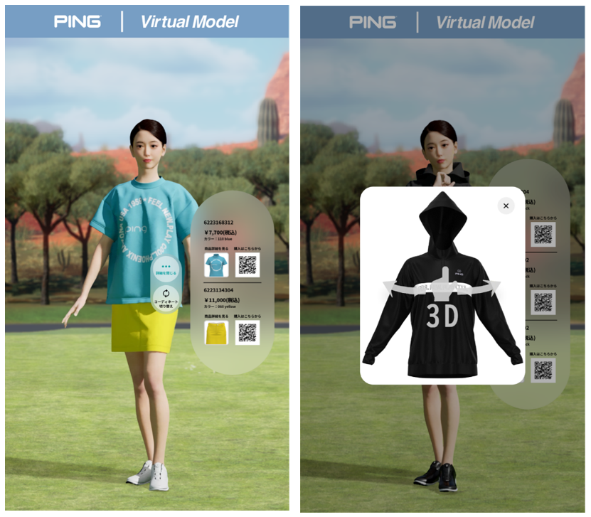 また、コーディネートの1各商品の情報や複数視点からの高精細なイメージが確認でき、QRコードを表示してECサイトの商品ページに送客できます。