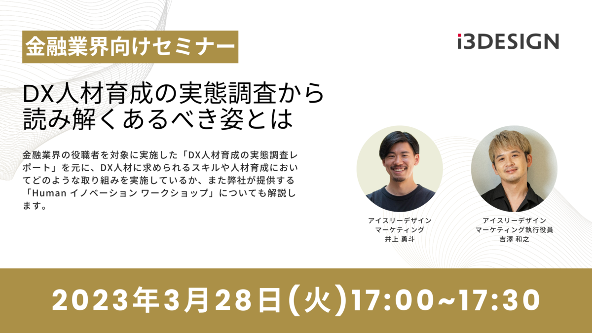 当セミナーでは、金融業界の役職者を対象に実施した「DX人材育成の実態調査レポート」を元に、金融業界のDX人材に求められるスキルや人材育成においてどのような取り組みを実施しているか、また弊社が提供する「Human イノベーション ワークショップ」についても解説します。