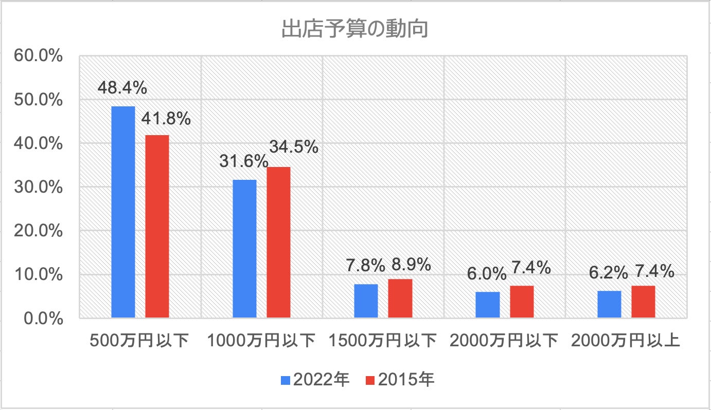 出店予算調査の結果を見ると、約半数(48.4%)が500万円以下で出店を希望していることがわかります。2015年の調査結果(https://www.synchro-food.co.jp/news/press/1325)では、500万円以下の割合(41.8%)が6.6%も低かったこと、また、今回は残りの「1000万円以下」から「2000万円以下」全ての割合が下がっていることから、全般的に出店予算が減少していると言うことができるでしょう。