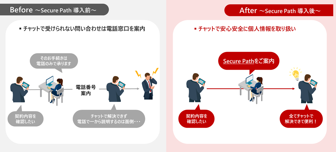このたびオリコ様の一部のサポート窓口へ導入したSecure Pathを、本人特定が必要な他の窓口にも展開することで、チャットサポートの利便性を高めるとともに、顧客満足度の向上やコンタクトセンターの業務効率化をサポートします。