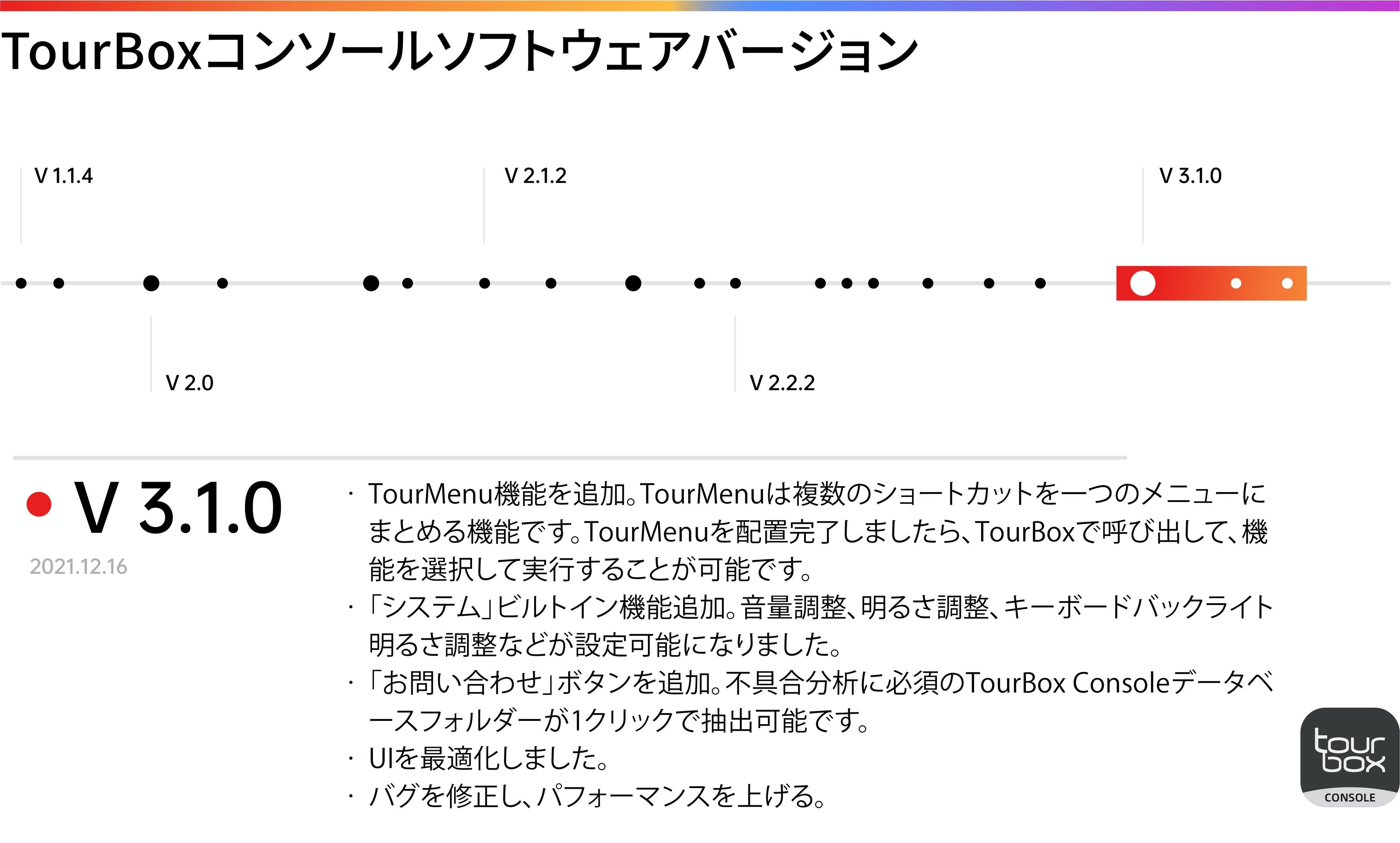 TourBoxコンソールソフトのバージョンは、現在3.1.0まで更新されています。いまでは、プリセットの自動切り替えやキー操作のマクロ設定、各種操作メニューを独自のメニューに登録して使える「TourMenu」を搭載。ユーザーの意見を元に新機能を追加し続けており、さまざまな分野のユーザーにご満足いただいています。
