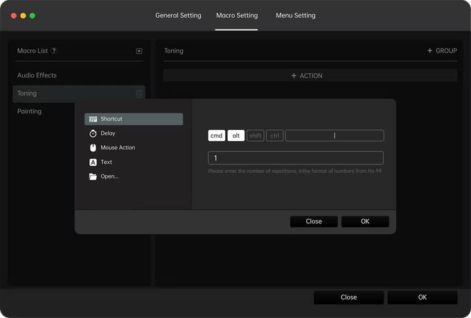 『TourBox』のコンソールソフトには、マクロ機能が用意されており、複数の連続するキー操作をワンクリックで行えます。キー操作の手順をマクロ機能に登録しておけるほか、マウス操作やテキスト入力、オープンパスなどの設定も可能です。しかもマクロは順序通り実行するほか、逆の順番や繰り返すといったこともできます。