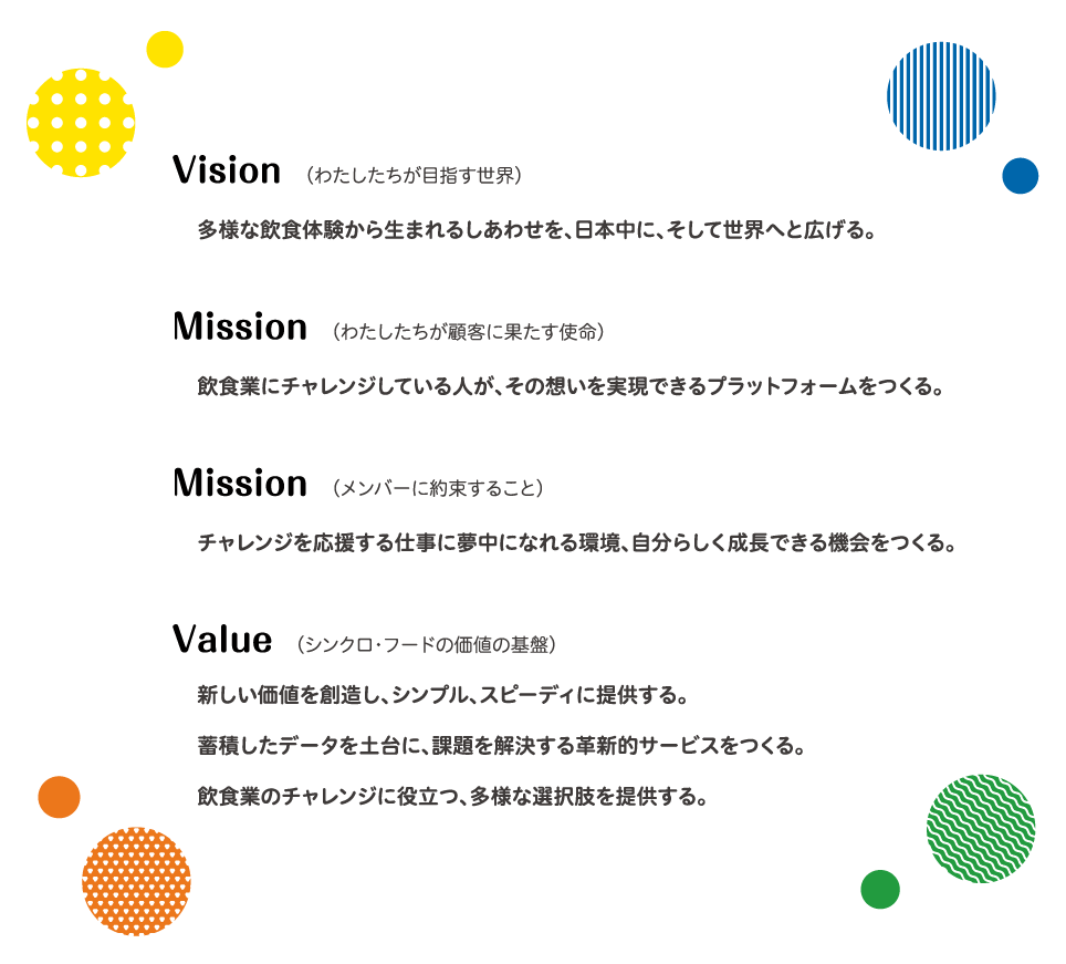 飲食業のチャレンジに役立つ多様な選択肢(情報・サービス)を提供し、飲食業に携わる方々の多様な想いを実現できる唯一無二のプラットフォームとして、進化し続ける想いを示しています。