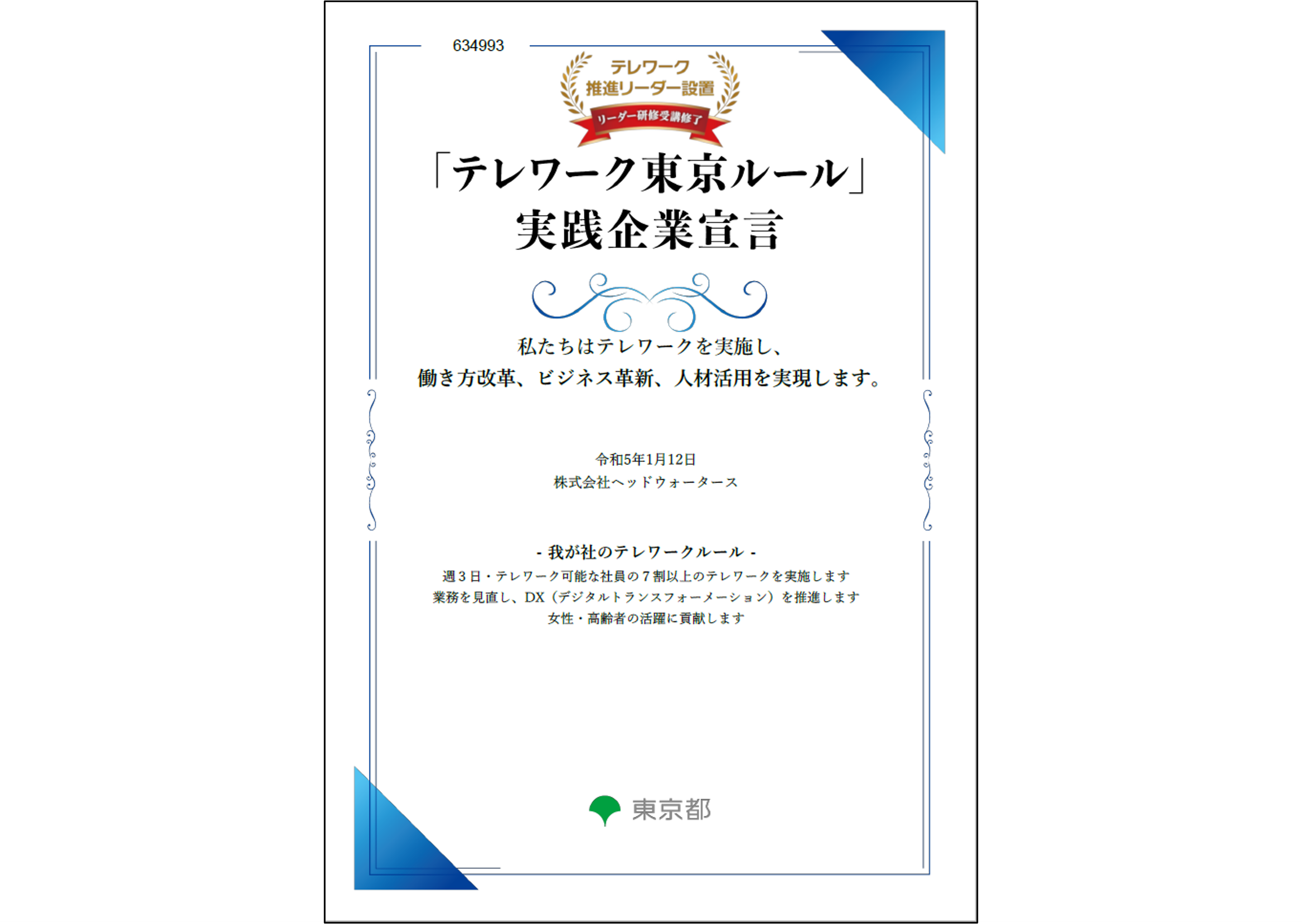 株式会社ヘッドウォータース|宣言企業の検索|「テレワーク東京ルール」実践企業宣言 URL: