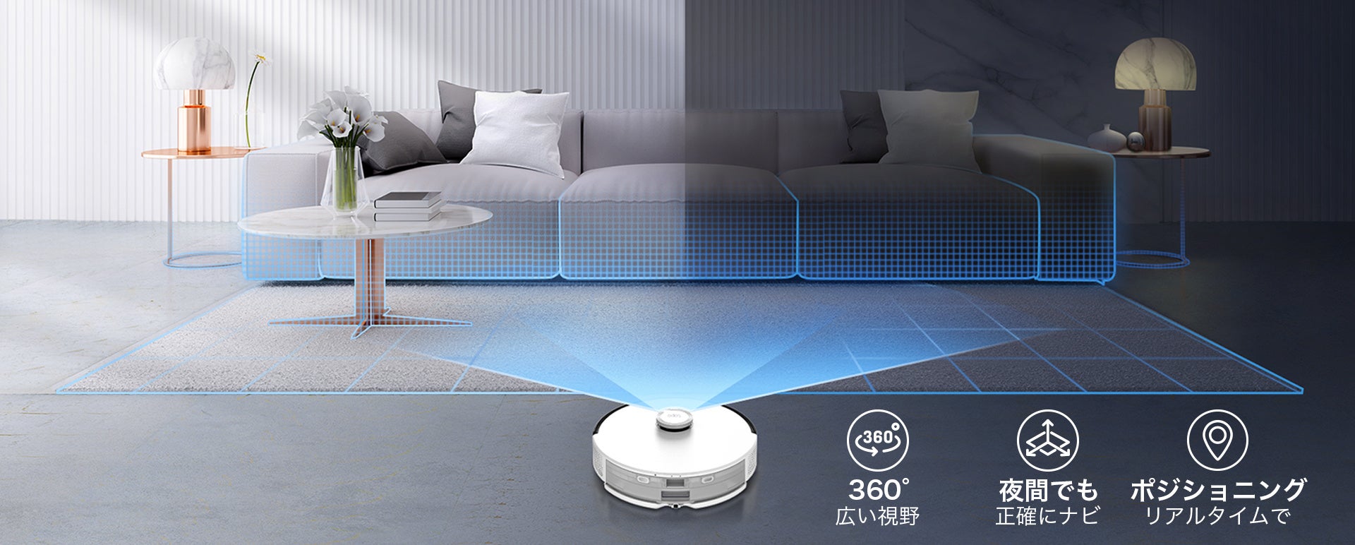 LiDAR&ジャイロのデュアルナビゲーションシステムが、お家の中を短時間で正確にマッピング。掃除漏れや無駄に同じ場所を繰り返し回ったりするのを回避し、暗いお部屋でもしっかりと働きます。