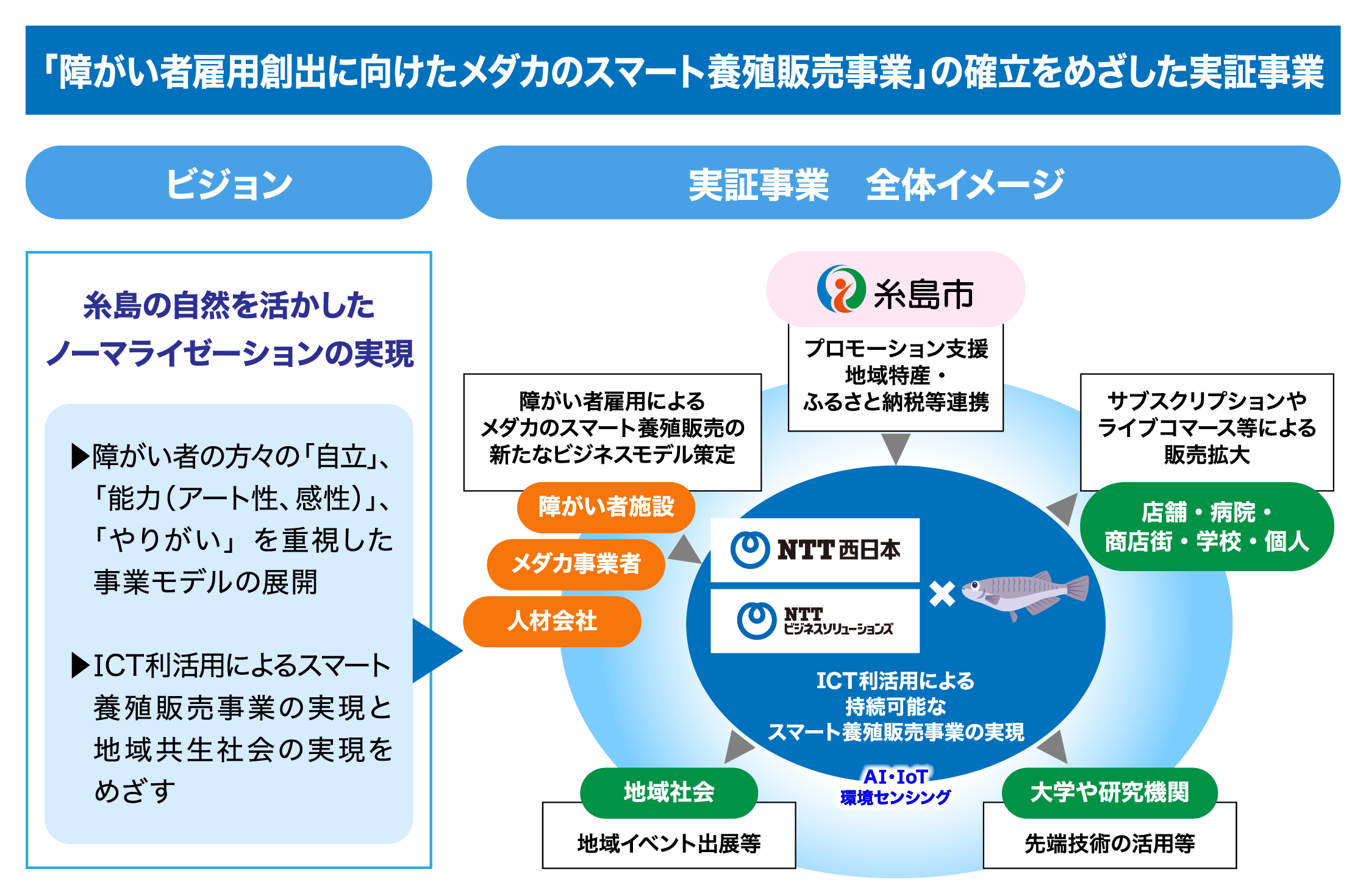 福岡県糸島市にあるNTT西日本通信ビルにおいてICTを活用したメダカのスマート養殖、障がい者の方々が働きやすい環境整備・就業促進、メダカの販売モデルに関する実証事業を行います。