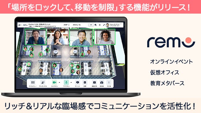 Webイベントや仮想オフィスのプラットフォームとして、世界中の様々なシーンで利用されている「Remo」に関し、リモ・ジャパン合同会社(本社:東京都中央区、代表取締役:ホーイン チェン)は、同ツールで運営する仮想スペース上の特定の場所の鍵の開け閉めを可能にする「場所のロック」機能の日本国内における正式リリースを発表しました。管理者は本機能をスペース運営に取り入れることにより、バーチャルオフィスやオンラインイベント会場の各所で行われる会話や打ち合わせの参加メンバーを、より容易・直感的に管理することが可能になります。