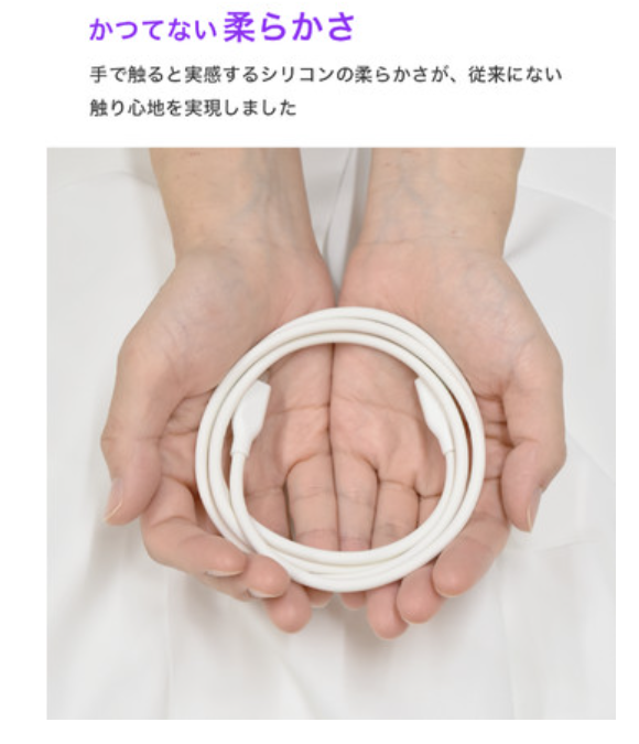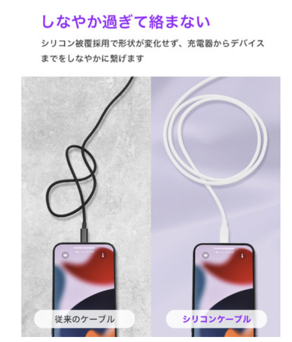 ケーブル被覆に柔軟性のあるシリコン素材を採用。しなやかで絡みづらいので使い心地・収納性にも優れます。心地よい肌触りで癖がつきにくいので、各デバイスの充電時ケーブルの取り回しに便利です。