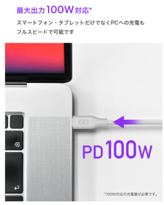 USB-C to USB-Cケーブルは最大100WのPD充電に対応。スマートフォンのみならずPD対応パソコンやタブレットなどでもご使用いただけます。