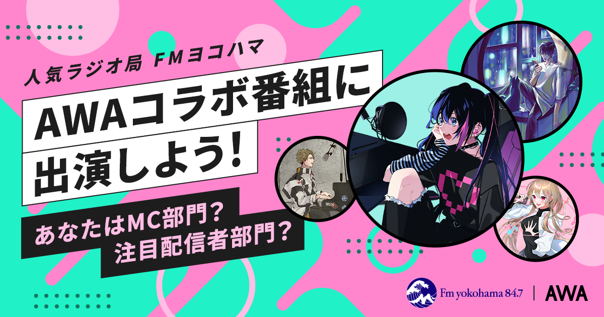 本日よりエントリーが開始されたイベントは、FMヨコハマのAWAコラボ番組『ラウンジスターレディオ supported by AWA』にサブMCまたは注目配信者として自分をPRできるコーナーに出演できる権利を贈呈する企画の第五弾となります。本企画は、トークをメインに活動する配信者だけではなく、歌い手やVsingerなどの歌をメインに活動している配信者の方にも、出演していただけるようにMC枠と注目配信者紹介コーナー枠の2部門をご用意いたしました。