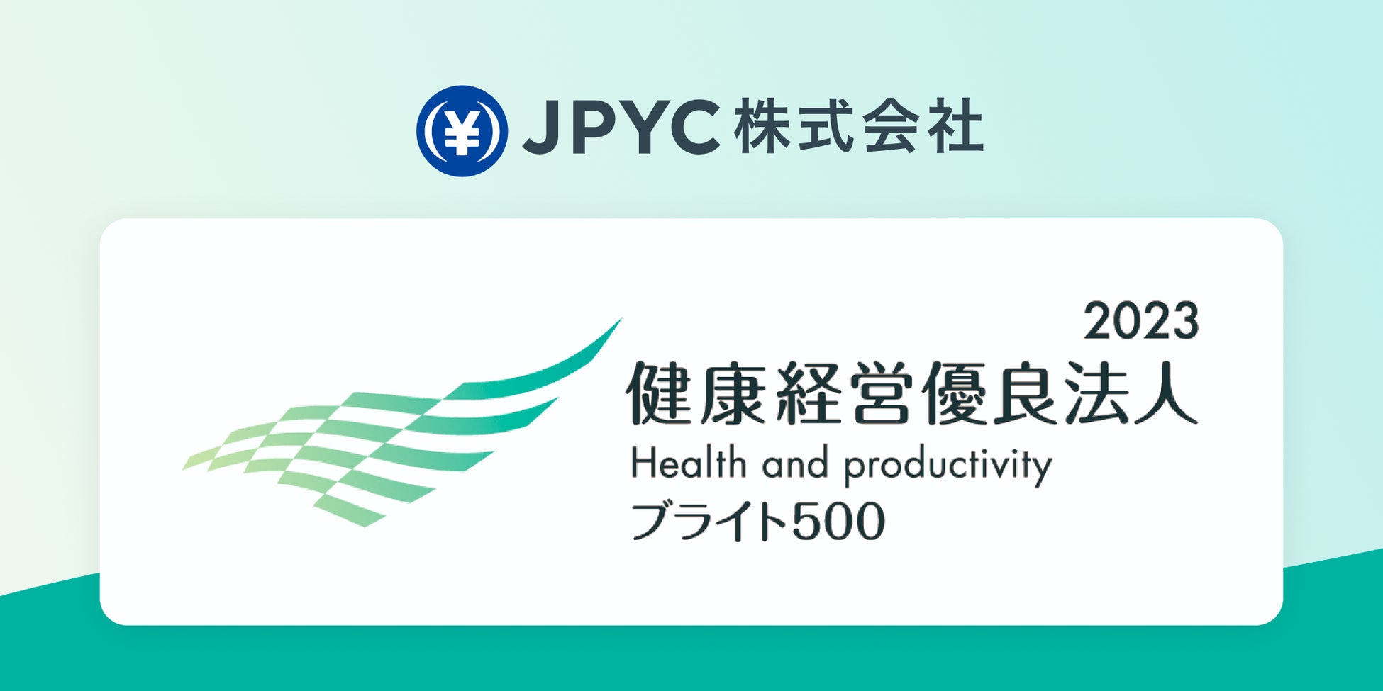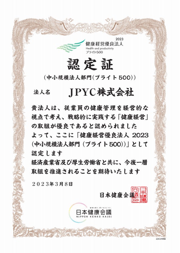 2023年度に中小規模法人部門で選定された14,012法人の中で、さらに上位500の法人は「ブライト500」とされており、JPYC株式会社はこの「ブライト500」にも認定されております。また、中小規模法人のブライト500認定取得は、協会けんぽの東京支部での被保険者の中では金融業で唯一の取得になります。