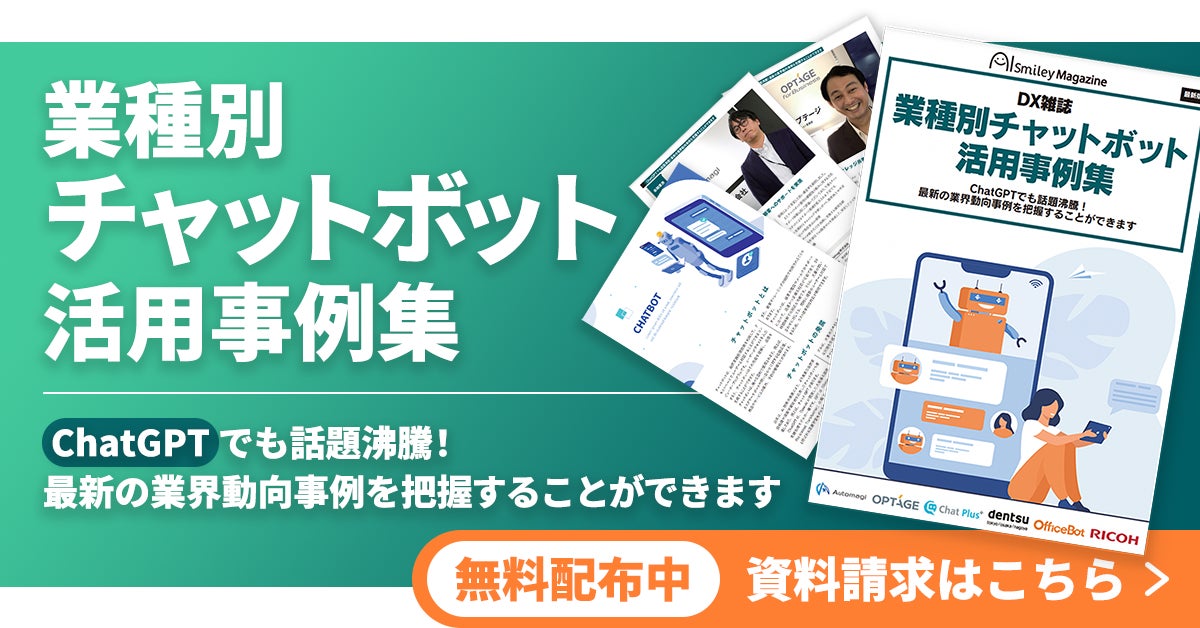 「業種別チャットボット活用事例集」(PDF)をお求めの企業担当者様は、 以下お問い合わせフォームに必要事項記入の上、 お問い合わせ内容欄に「業種別チャットボット活用事例集」希望と記載し送信ください。