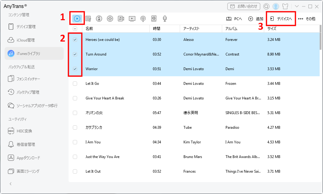 もう一つの方法は、AnyTransを使うことです。AnyTransを使ってiTunesの曲をiPhoneに入れて、しかもiPhoneに元の曲やビデオなどのメディアファイルを削除しません。ご安心ください。