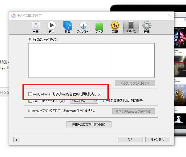 iPhoneをiTunesに接続すると、知らないうちに自動同期することもあります。iPhoneのデータを自動的にiTunesと同期しないように、「iPod、iPhone、および iPad を自動的に同期しない」のチェック状態を確認してください。