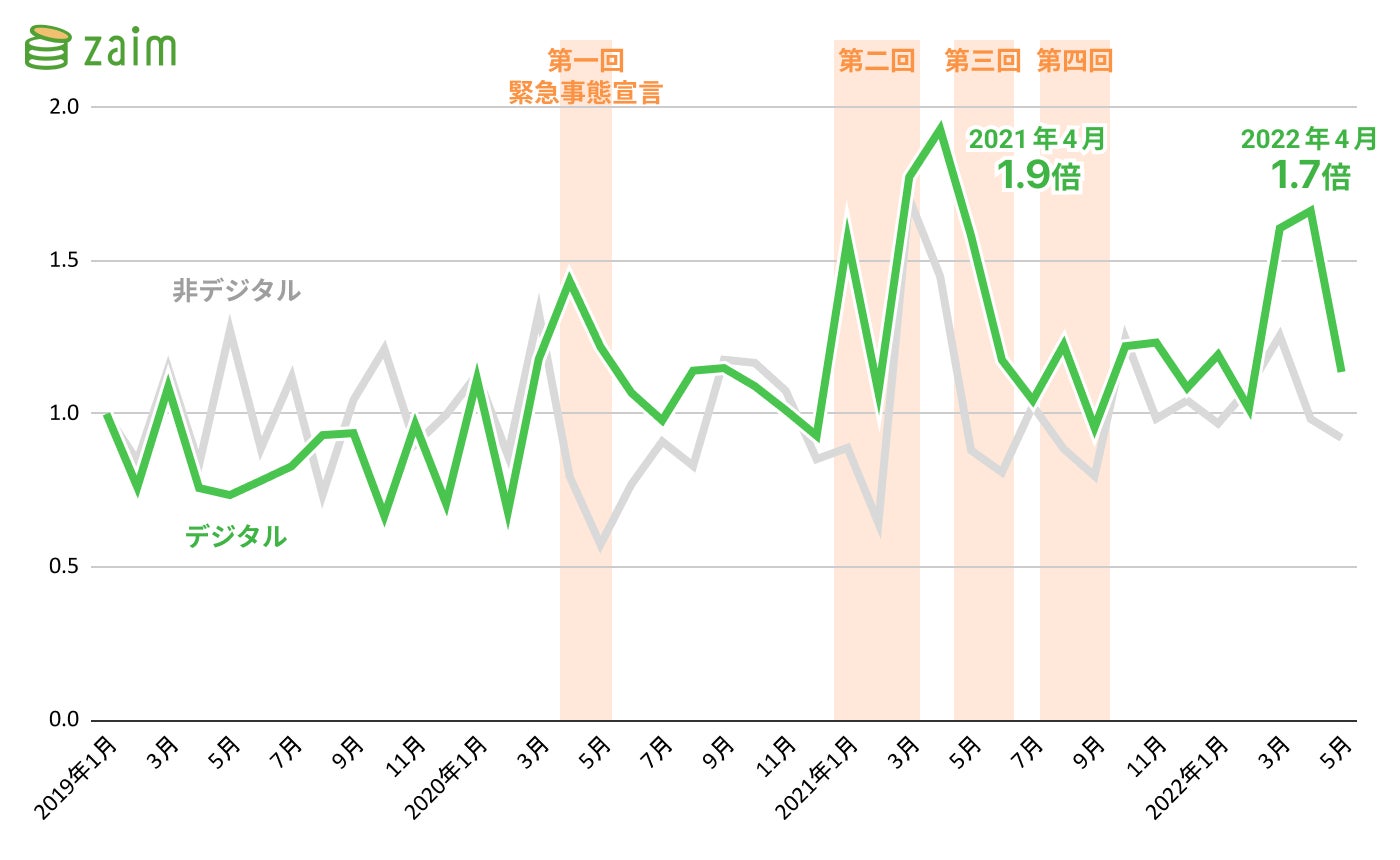 - 2019 年 1 月を基準とした変化率において、2021 年 4 月時点は約 2 倍にまで上昇、非デジタルも復活