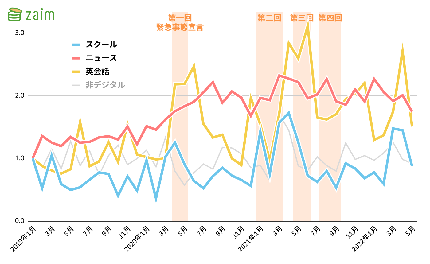 「教育・教養」におけるジャンルごとの DX 変化率を見ると、デジタル新聞やニュースアプリの購読が含まれる「ニュース」は引き続き約 2 倍の需要を維持しています。また 多様な選択肢を持つオンライン「英会話」は通年人気があり(Zaim の記録において現時点で 128 のサービスが確認できるほど)、こちらも引き続き約 2 倍で推移しています(図 3)。