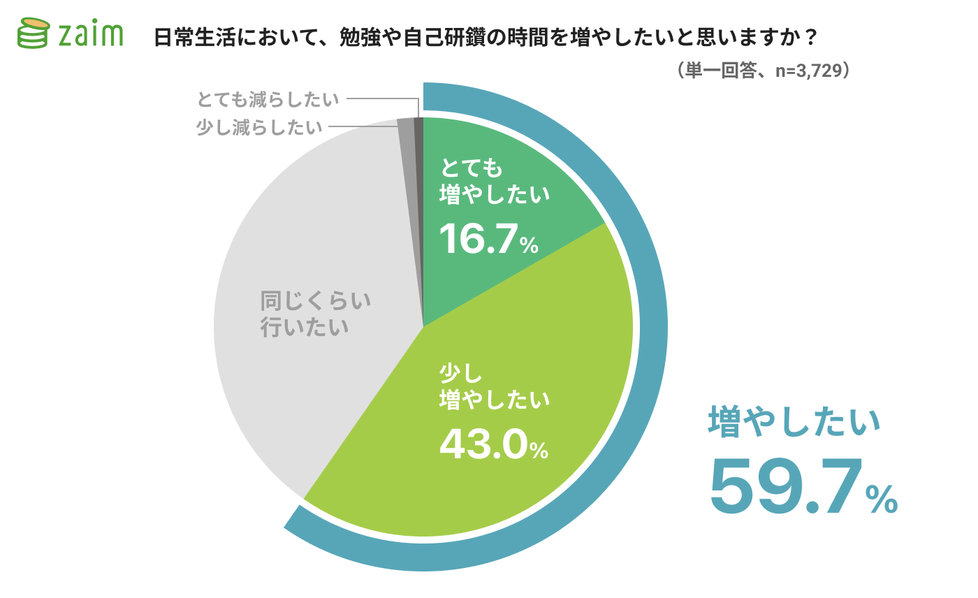 Zaim ユーザーを対象にしたアンケート調査 *4 の結果からも、約 6 割の人が日々の生活において勉強や自己研鑽の時間を増やしたいと考えていることがわかります(図 4)。今後も Zaim は「教育・教養」の DX の進行に注目するとともに、利用者の暮らしの変化を分析し、社会的変化の把握に寄与する活動を通じて、暮らし改善へのサービス改善を更に進めてまいります。