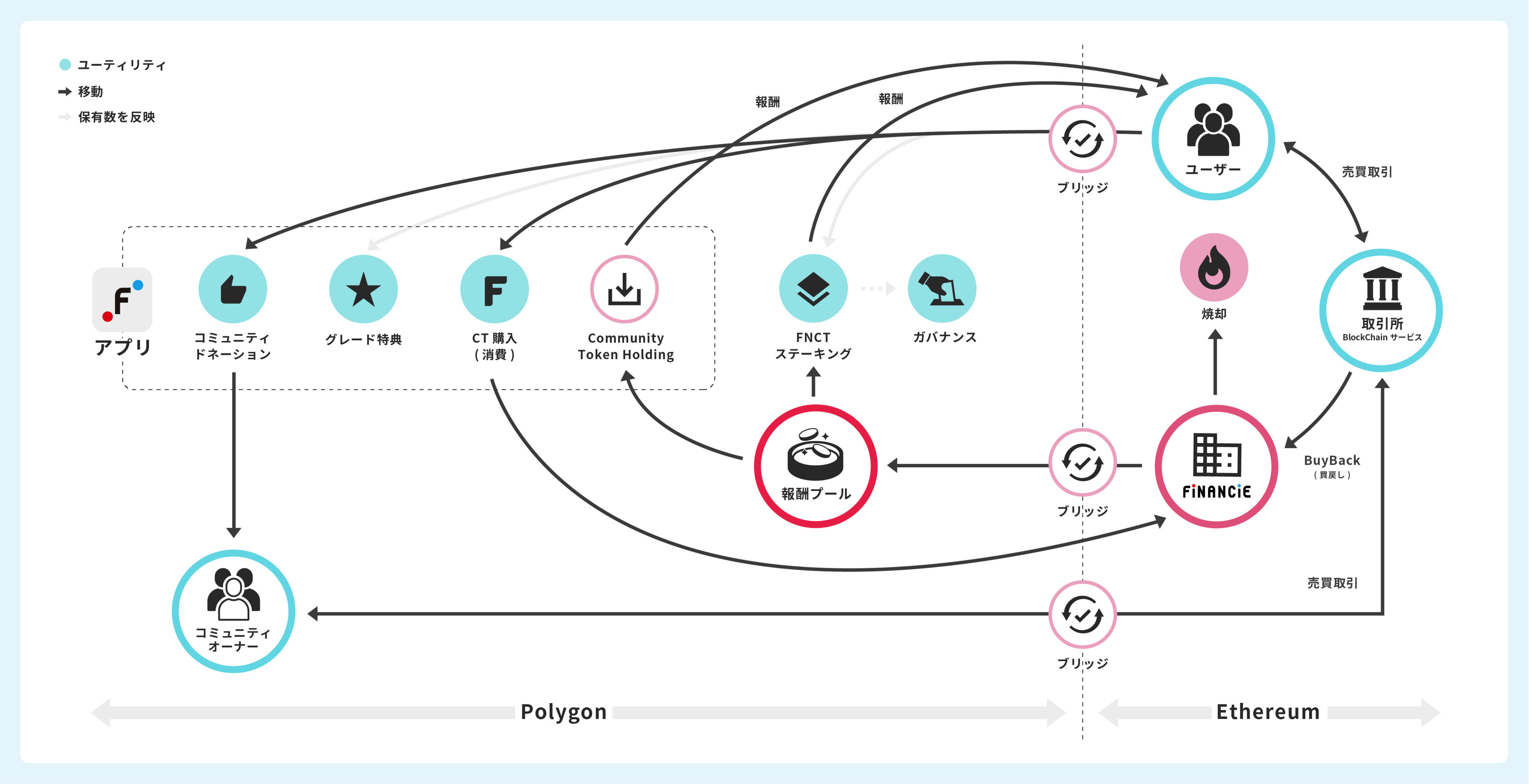 フィナンシェトークン(FNCT)の具体的な活用例としては、FiNANCiEのユーザーに報酬として付与、FiNANCiE上の優良なコミュニティが継続的に成長するためのインセンティブとしての使用などを予定しています。また、フィナンシェトークン(FNCT)はFiNANCiEのエコシステム全体におけるガバナンスに参加できる機能も有し、「ユーザー主体の運営」の実現に寄与します。