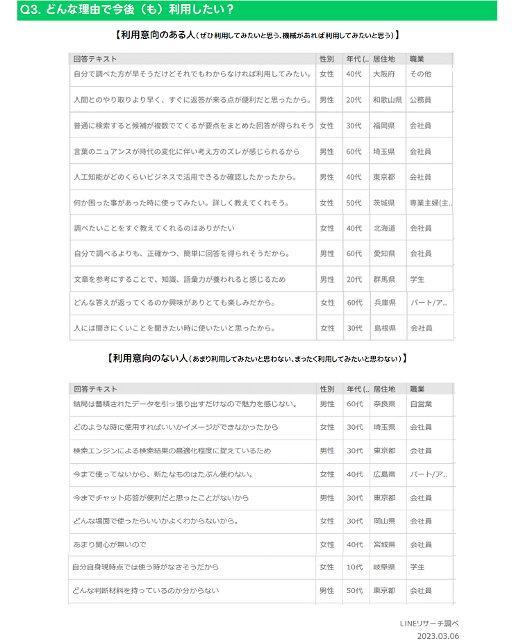 「ChatGPT」を今後(も)【利用してみたいと思う】人、【利用してみたいと思わない】人のそれぞれの理由について、自由回答で答えてもらいましたので一部紹介します。