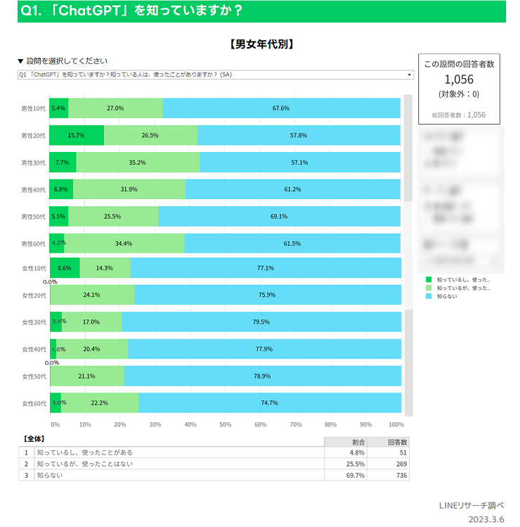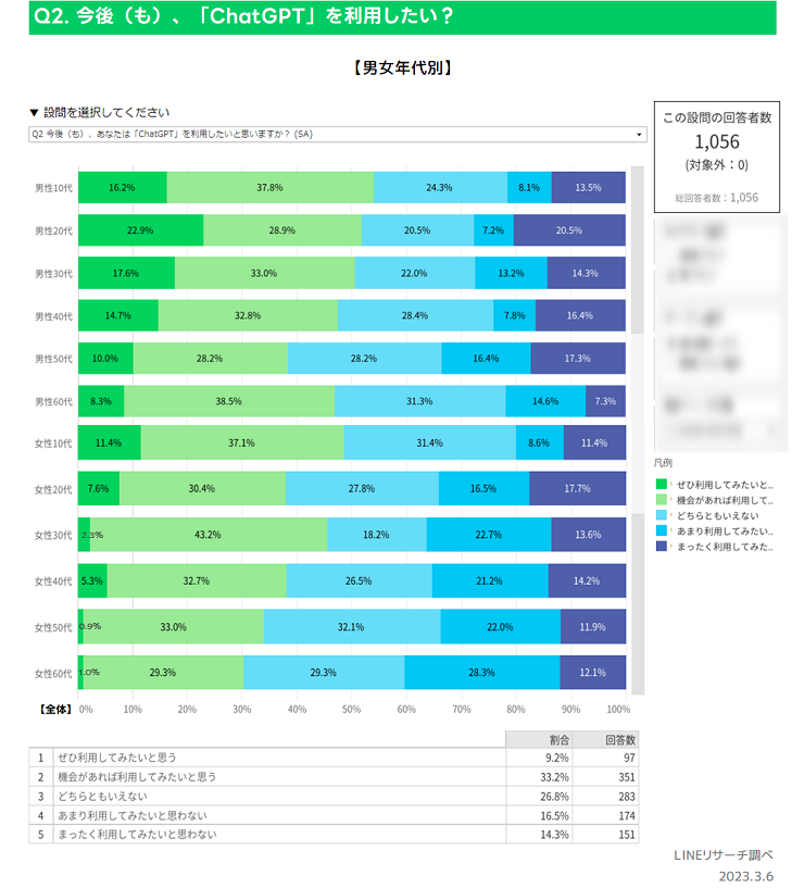 このたびLINEリサーチでは、日本全国の男女を対象に、「ChatGPT」の認知率や利用意向などについて調査しましたので、その結果をお知らせいたします。