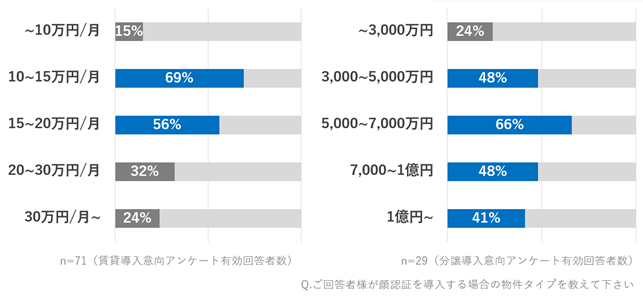 賃貸住宅では過半数が10~20万円/月の賃料の物件で導入を検討頂いている一方、分譲では5,000~7,000万円が60%超で最多も、3,000万円から1億円以上の物件まで幅広く導入を検討頂いていることが分かりました。