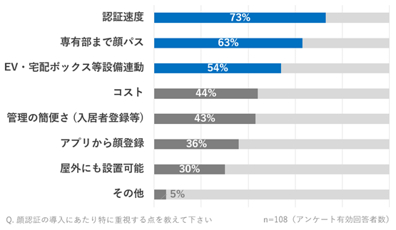 マンションへの顔認証導入時に重視する項目トップ3は、「認証速度」「専有部まで顔パス」「EV・宅配ボックス等設備連動」
