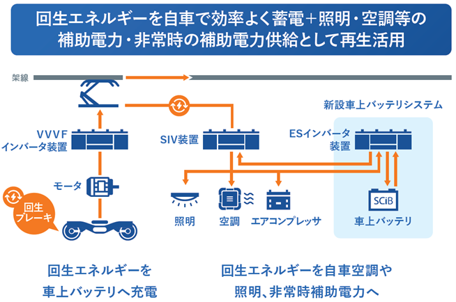 今回採用されたのは、東武鉄道がCO2排出量削減の取組みとして2024年度から順次導入を開始予定の東武アーバンパークライン向け新型車両向け車上バッテリシステムです。列車がブレーキを掛けた際に発生する回生エネルギーを蓄電池に蓄え、空調などの補助電力の一部として活用することで、省エネ運転・CO2削減に貢献します。さらに装置故障等の非常時には走行に必要なブレーキ用コンプレッサ等への電源の供給を行い、冗長性を確保します。