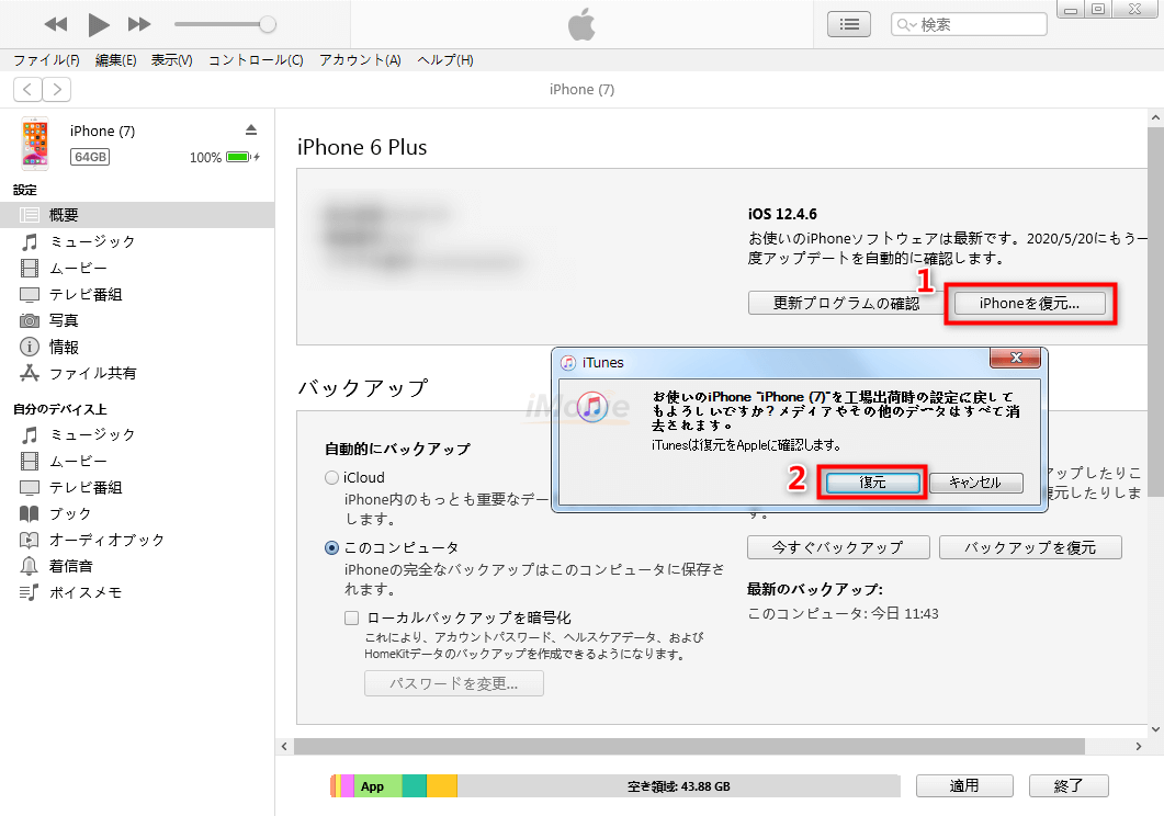 Step 4.iTunesでは「iPhoneを復元」をクリックします。それで画面指示に従って操作してください。