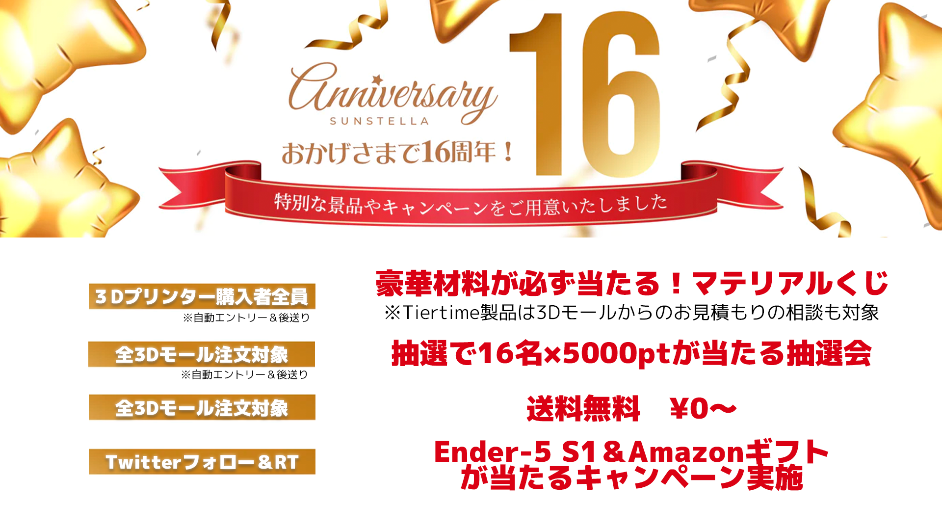 - ④サンステラTwitterをフォロー&対象ツイートをリツイートした方から抽選で1名様にEnder-5S1プレゼント(1名)& Amazonギフト1,000円×10名プレゼント(3月12日投稿)