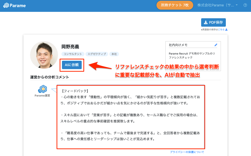 当社では、採用業務の手間を減らしリファレンスチェック効率を最大化するために、OpenAI社の「ChatGPT」で活用されているgpt-3.5-turboを活用し「リファレンスチェックの質問内容を要望に応じて提案してくれる」「リファレンス結果の中から選考判断に重要な記述を抽出してくれる」というAIサポート機能(β版)を開発しました。本機能のβ版はParameをご導入のお客様は無料でご利用いただけます。