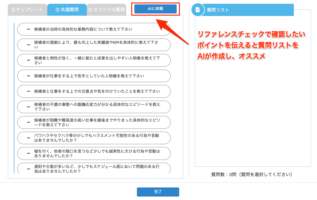 ①リファレンスチェックの質問内容を要望に応じて提案してくれる