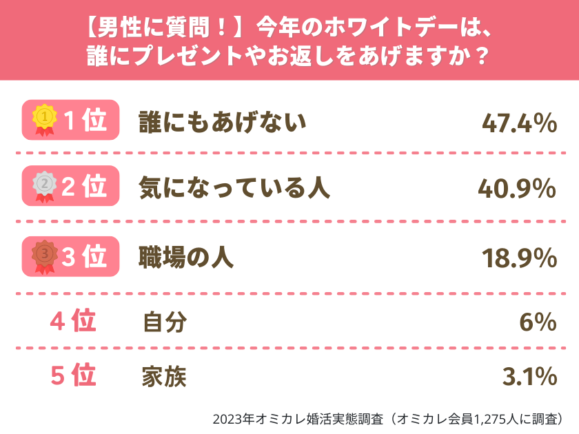 もうすぐホワイトデーということで、男性に質問したのは「今年のホワイトデーは誰にプレゼントやお返しをあげますか?」